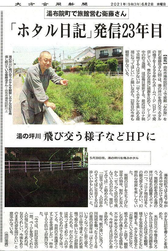 本日はうちの前から蛍観橋間で3匹、そしてうちの庭で1匹を確認致しました。 |